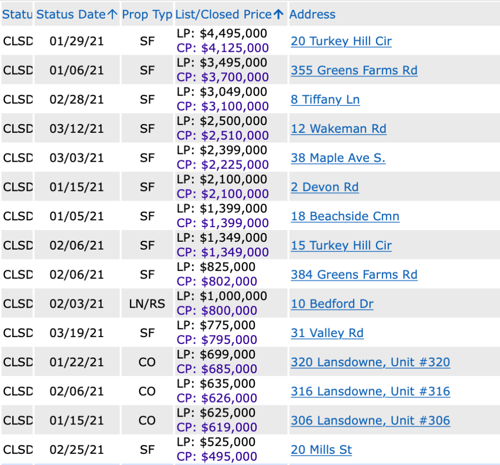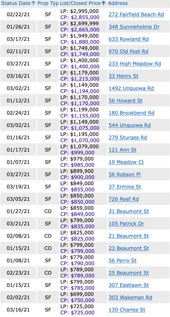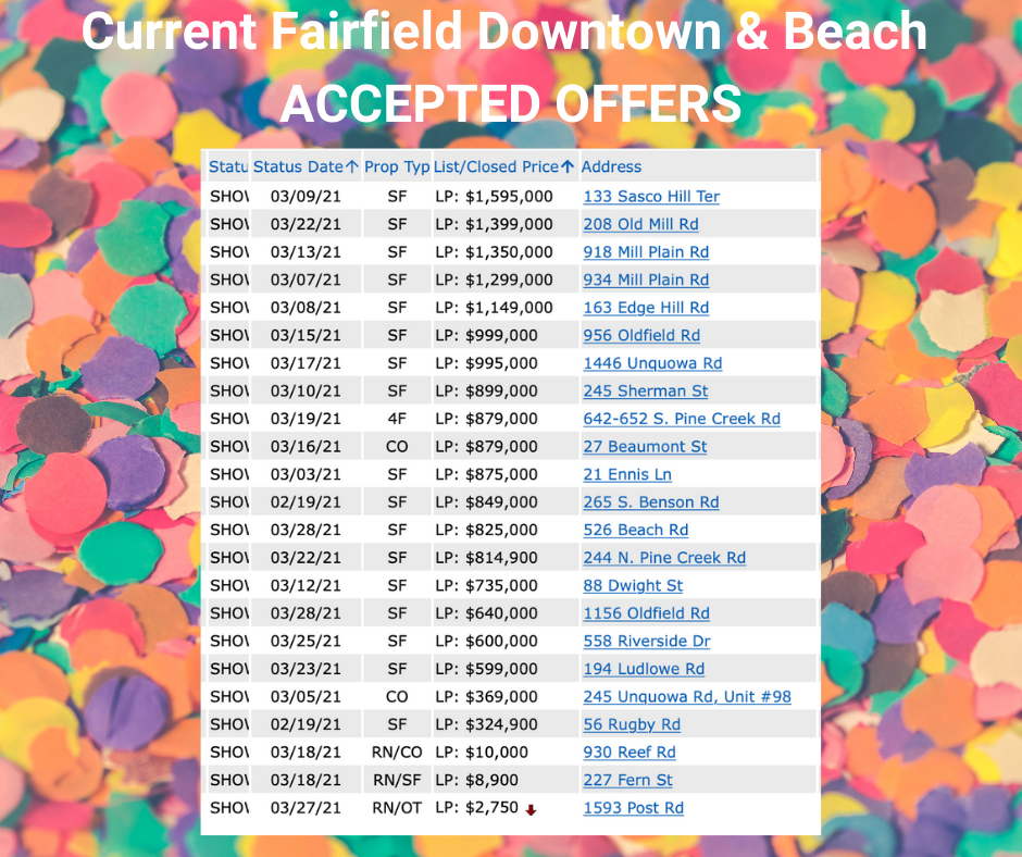 2 thoughts on “SOLD and New Accepted Offers: Fairfield Downtown and Westport Greens Farms YTD through 3/29/21