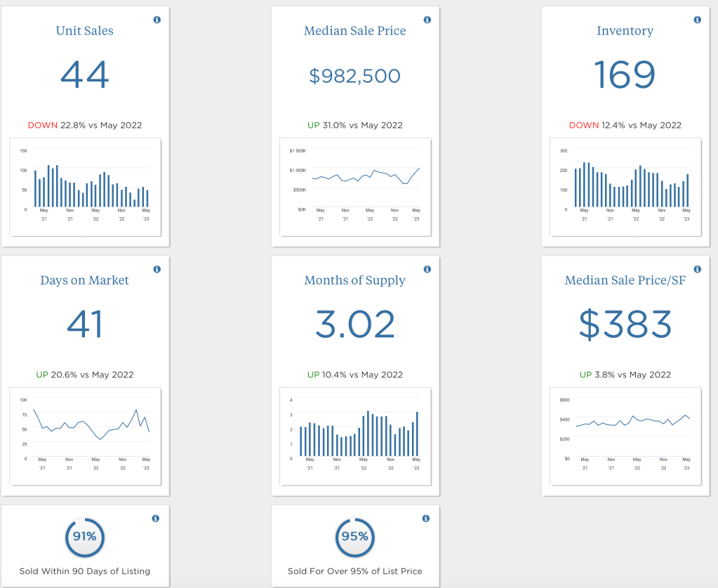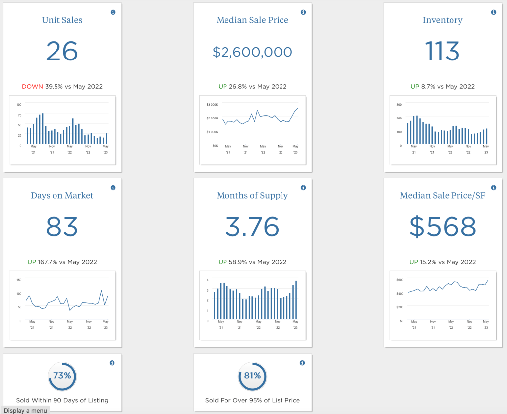 The charts below show a summary of what happened in May compared to May 2022. And my What Sold Reports show all the single-family homes that sold in May 2023 in Fairfield and Westport Connecticut.