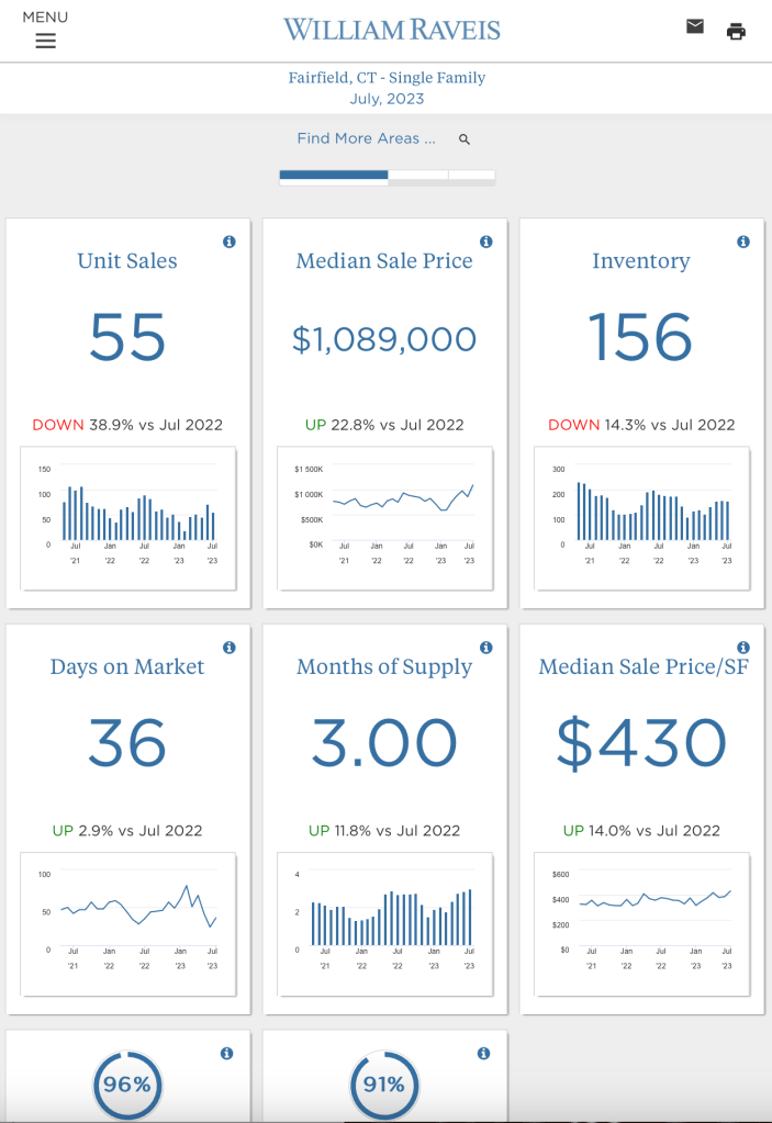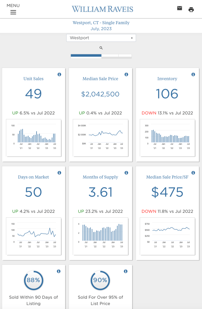 The charts below show a summary of what happened in July 2023 compared to last July. My What Sold Reports include a list and summary of all the single-family homes that sold in July 2023 in Fairfield and Westport Connecticut.