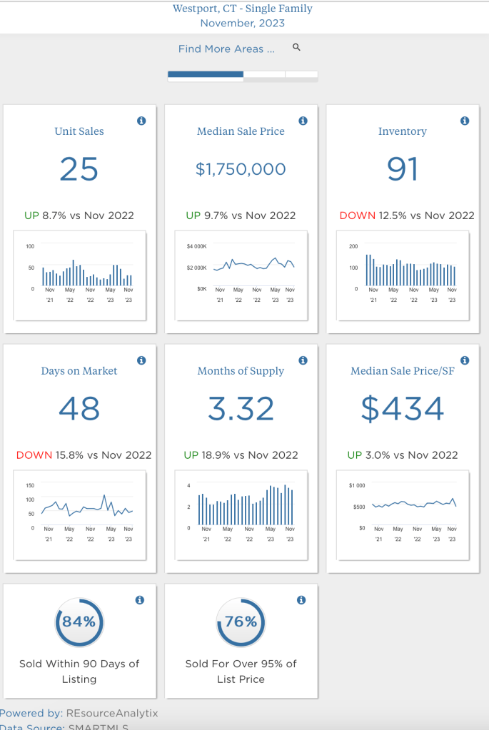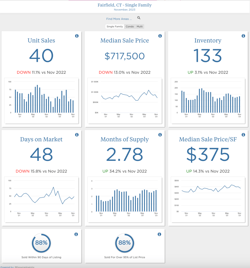 Happy Holiday Season! The November numbers are in. As 2023 comes to a close, let’s take a look at what happened in our local Fairfield and Westport markets in November. For a list of all the single-family sales, explore the What Sold Reports. If you love the visuals, charts await you below! ⬇️