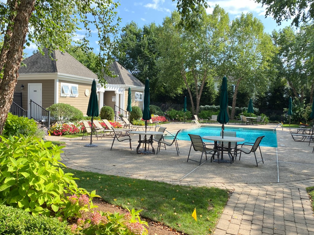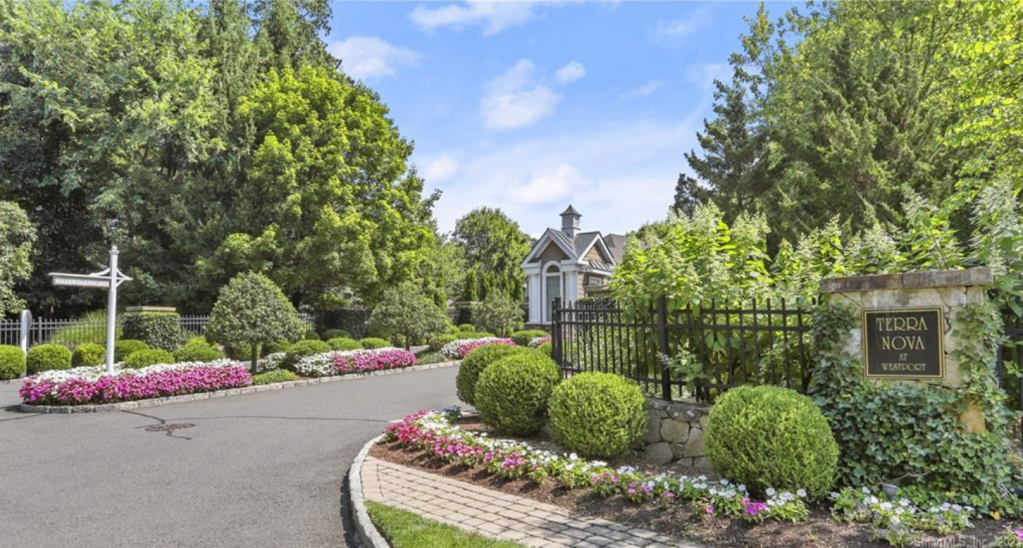Fantastic private end unit near the pool with a first-floor master suite and walk-out lower level! Approach via the tree-lined boulevard with natural stone walls, lush landscaping, and an elegant iron gate. Welcome to the sophisticated living offered by this luxury condo in Westport, Connecticut. Enjoy the privacy and scenic views of the woods framing your deck, backyard, and patio outside the lower level. The open floor plan features a grand entry that opens to the living room with a vaulted ceiling, fireplace, and private deck.