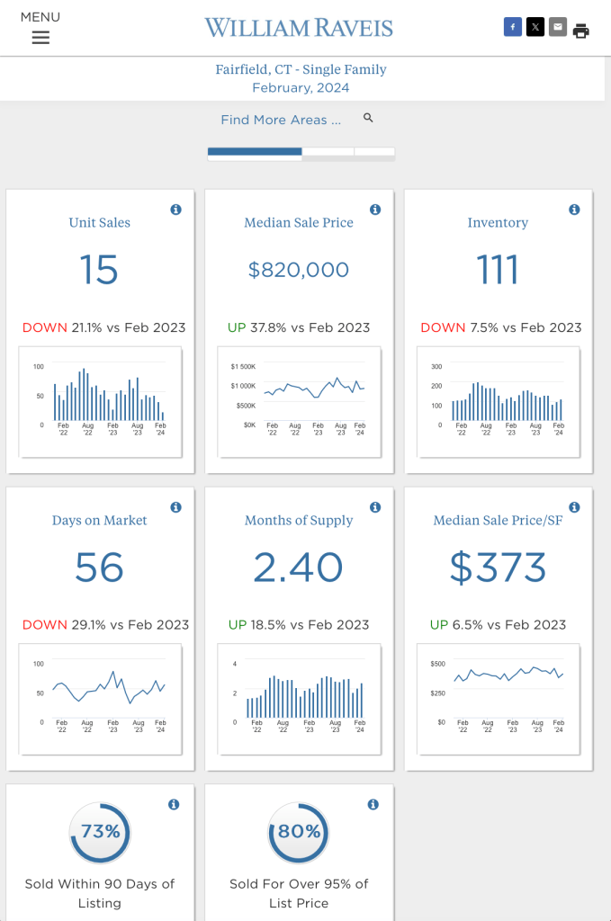 - The median sale price in Fairfield was $820,000, up 37.8% compared to February 2023. The median sale price per square foot was up 6.5% to $373. In Westport, the median sale price was $1,600,000, down 1.5%, and the median sale price per square foot was $534, which was up 5.1% from last February.