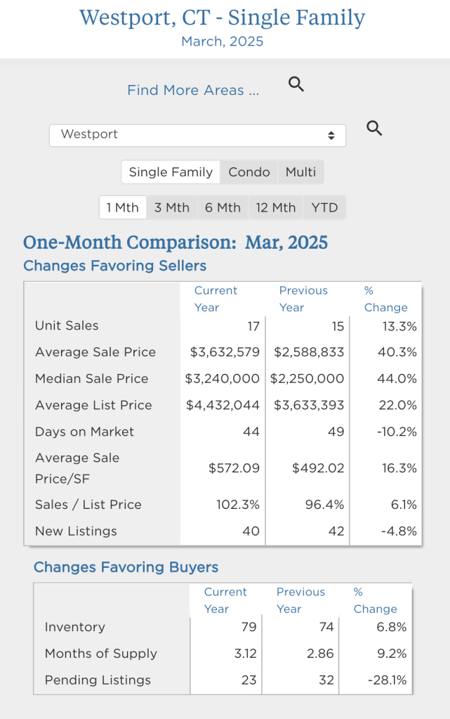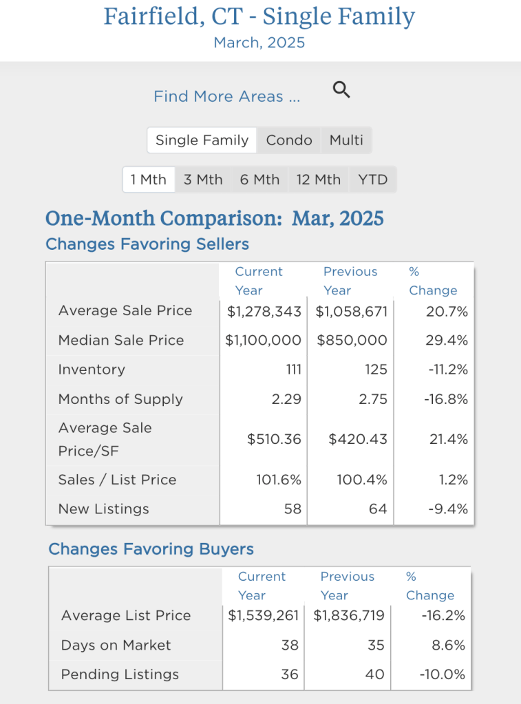 Word on the street- is that prices continued to rise in Fairfield and Westport! Here’s a summary of what happened in March in our local Fairfield and Westport single-family housing markets compared to a year ago in March 2024.
